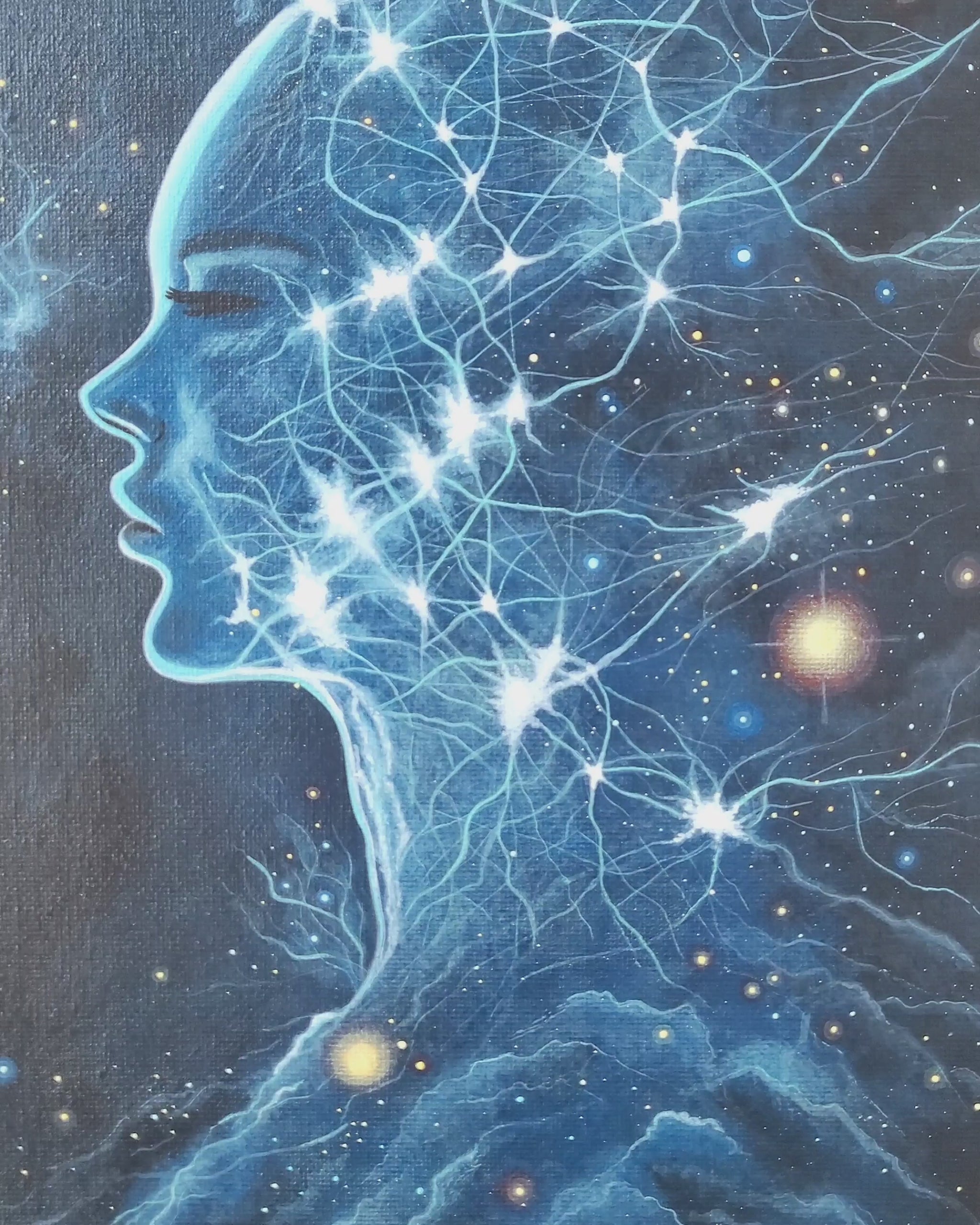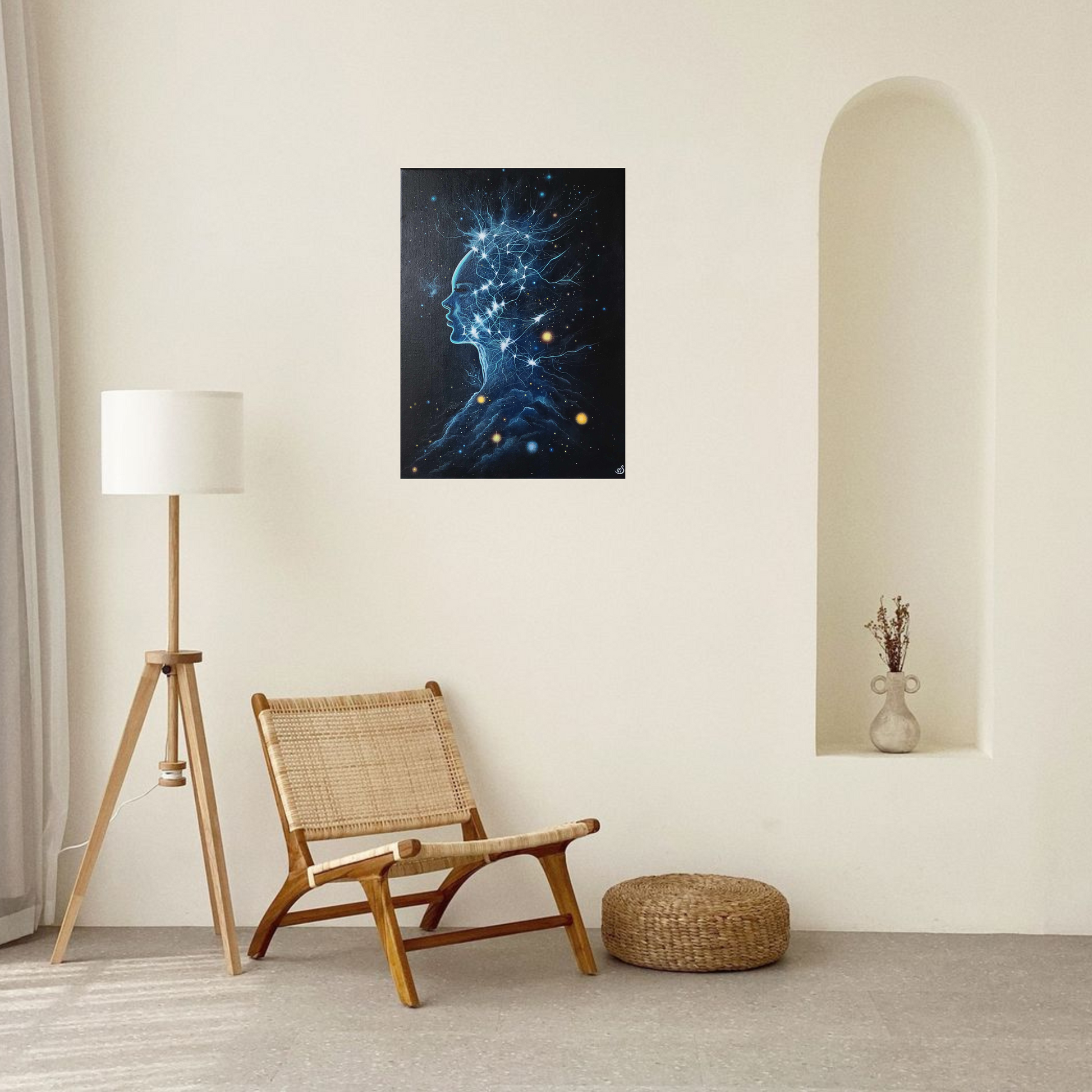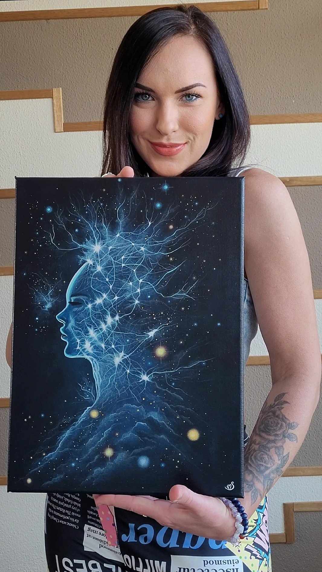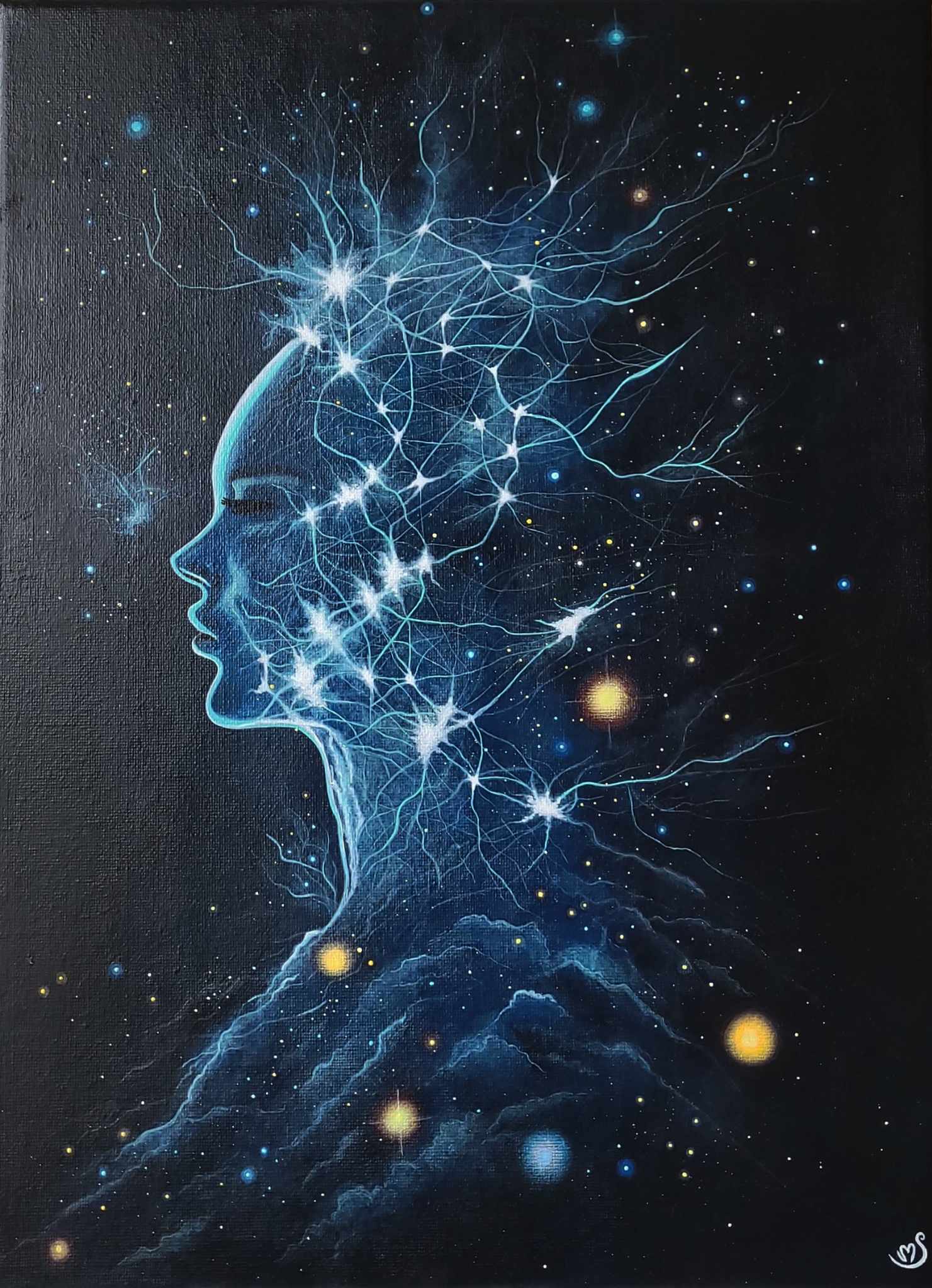 "Divine Connections" is a visual meditation on the unity of all that exists. The painting reveals the side profile of a human face, yet its form dissolves into the surrounding space, no longer bound to the physical, but expressed as pure energy, a field of conscious vibration. From within the head, streams of light resembling neurons extend far beyond the limits of matter, reaching into the stars, the nebulas and the infinite depth of cosmic being.