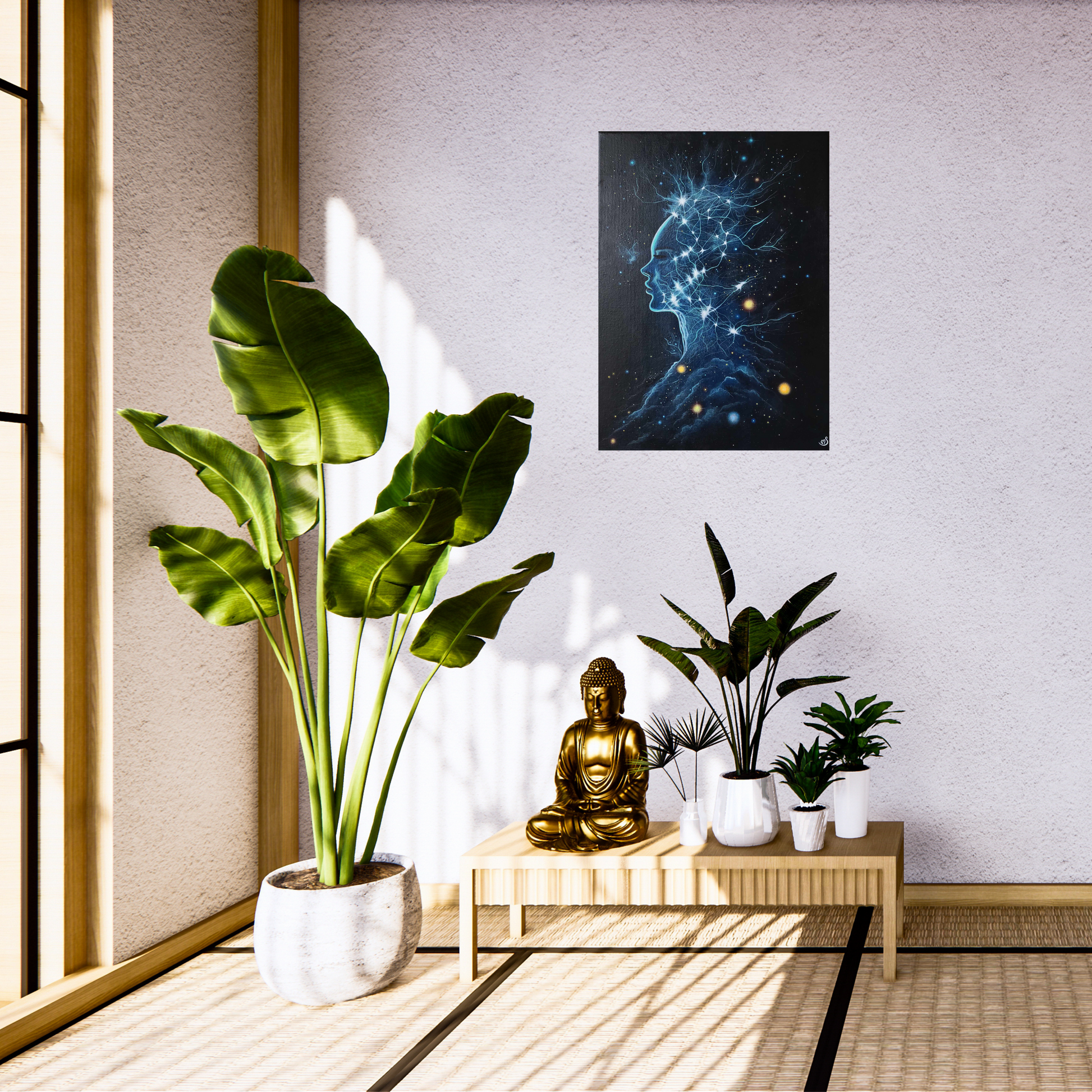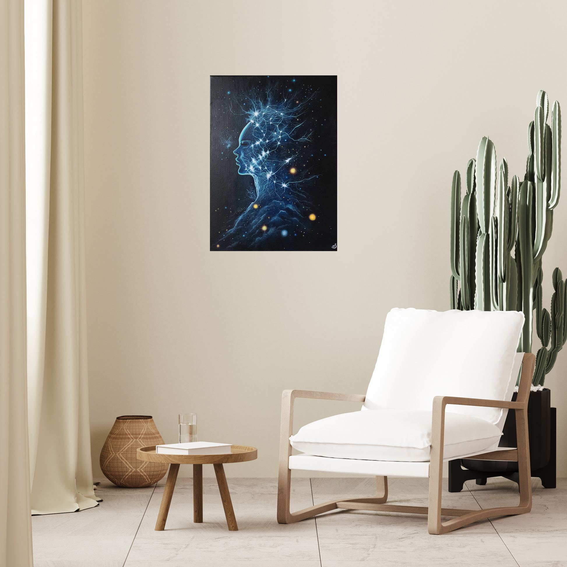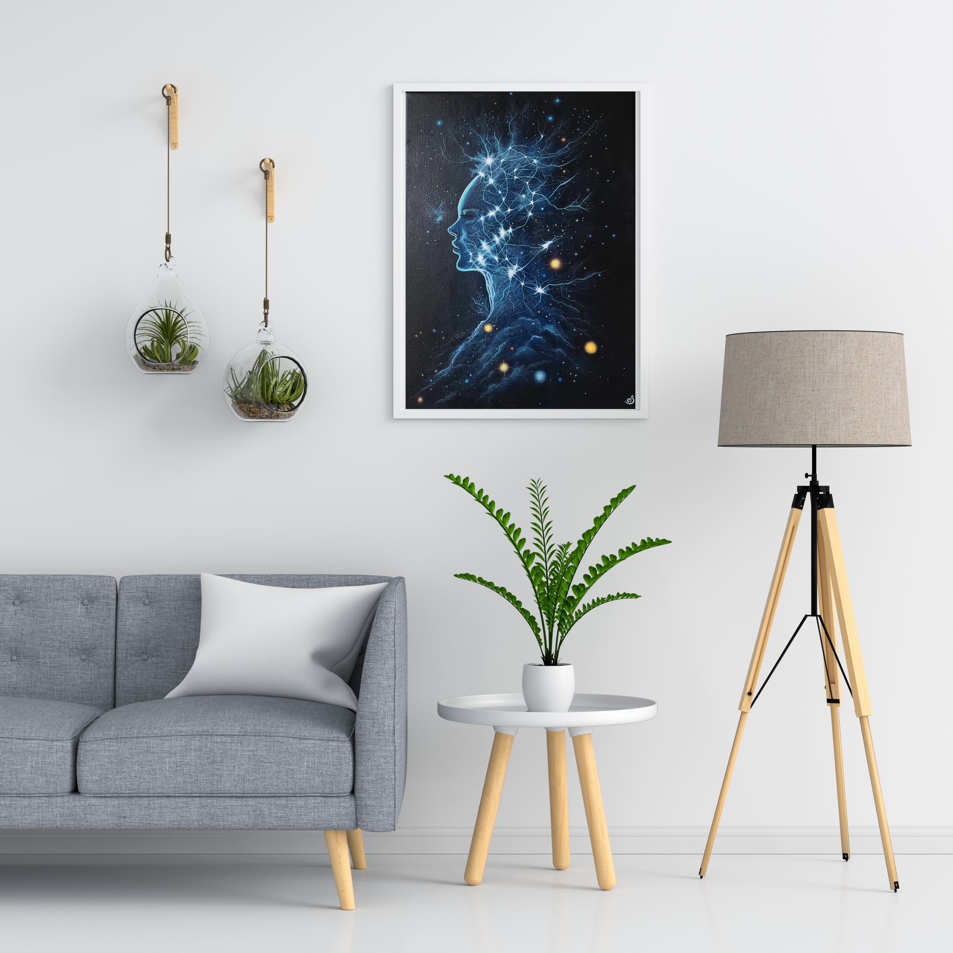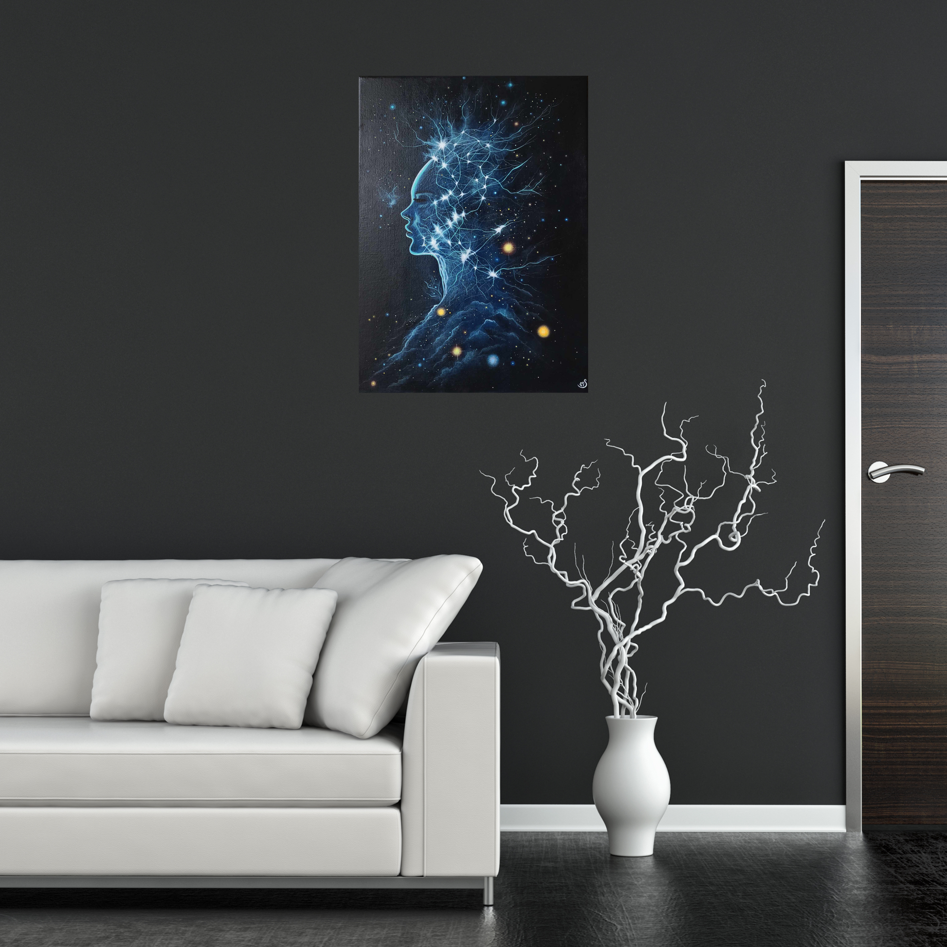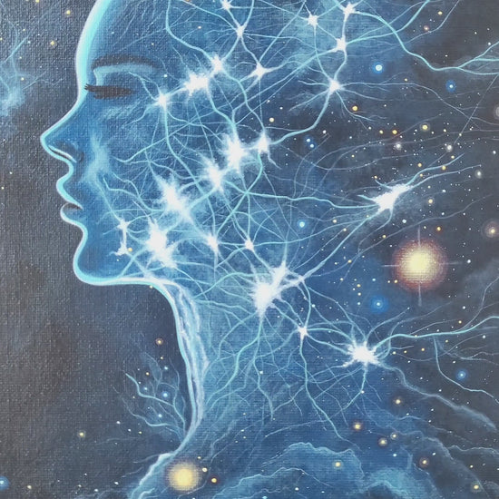 "Divine Connections" is a visual meditation on the unity of all that exists. The painting reveals the side profile of a human face, yet its form dissolves into the surrounding space, no longer bound to the physical, but expressed as pure energy, a field of conscious vibration. From within the head, streams of light resembling neurons extend far beyond the limits of matter, reaching into the stars, the nebulas and the infinite depth of cosmic being.