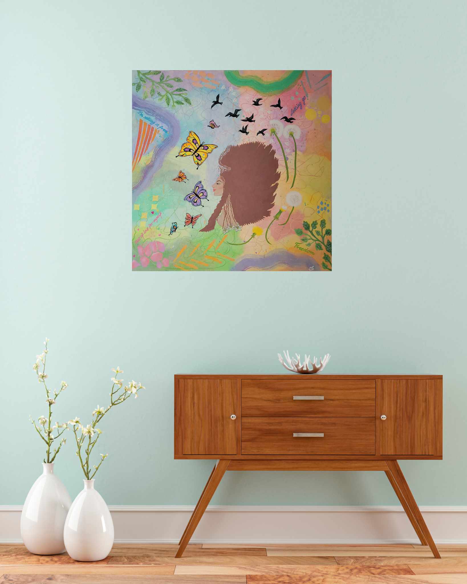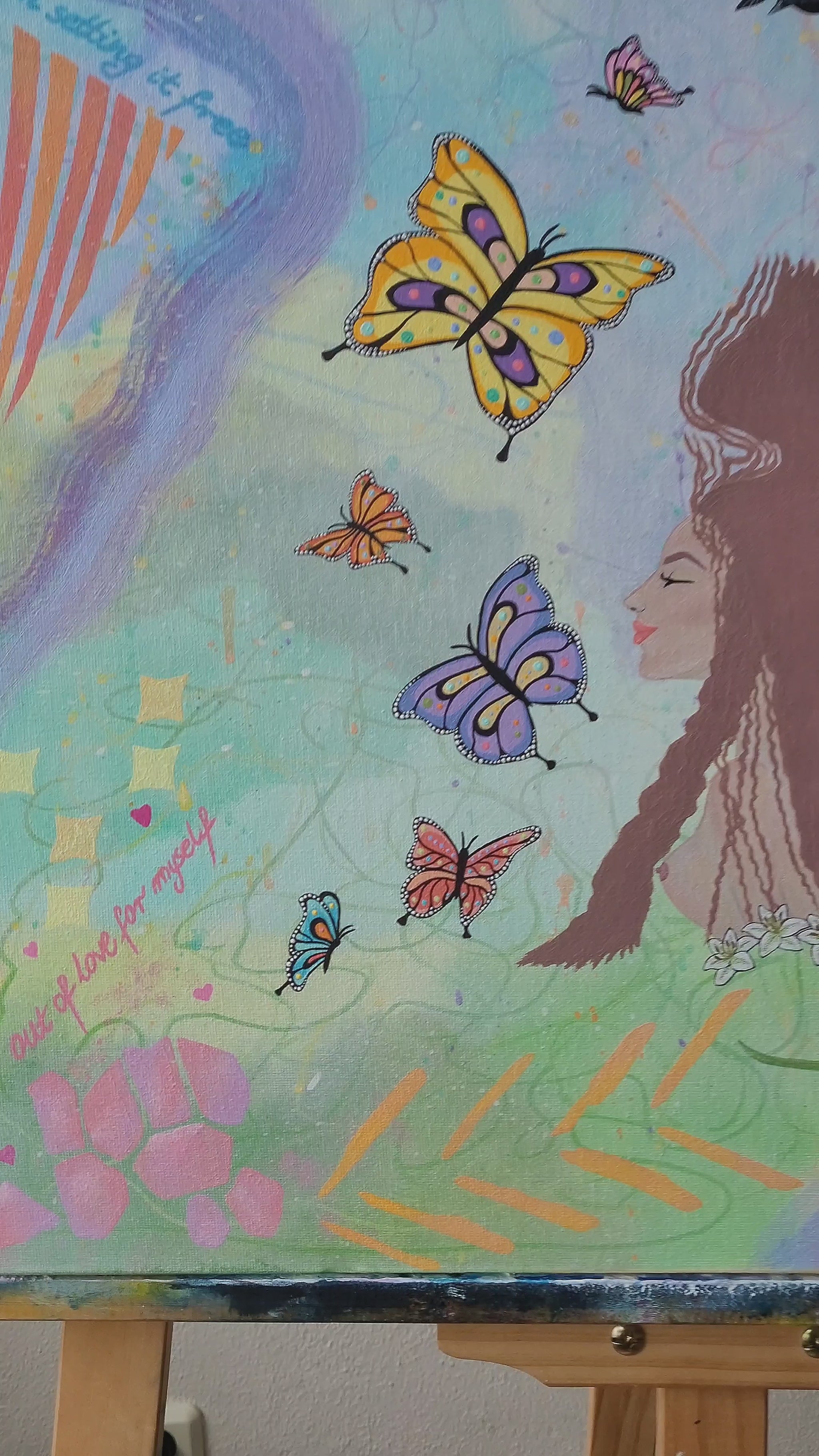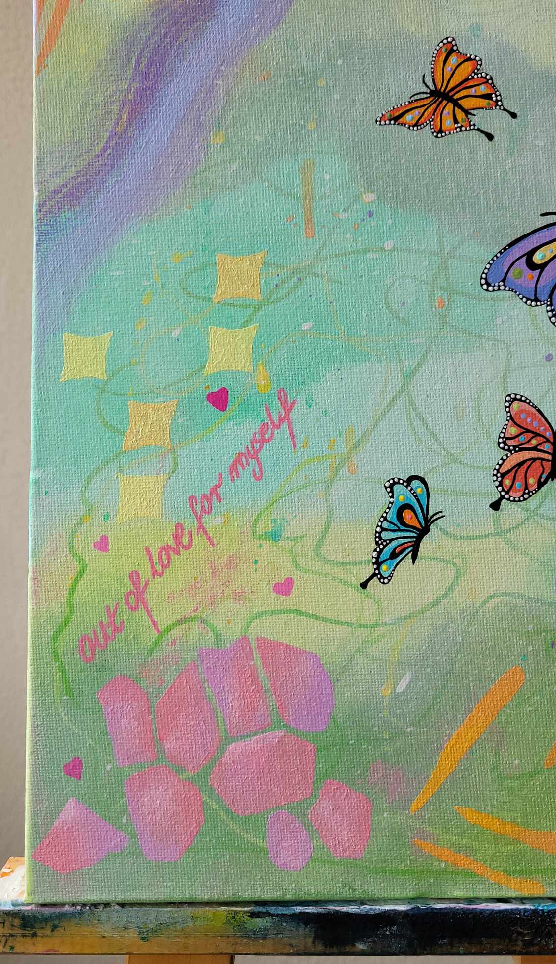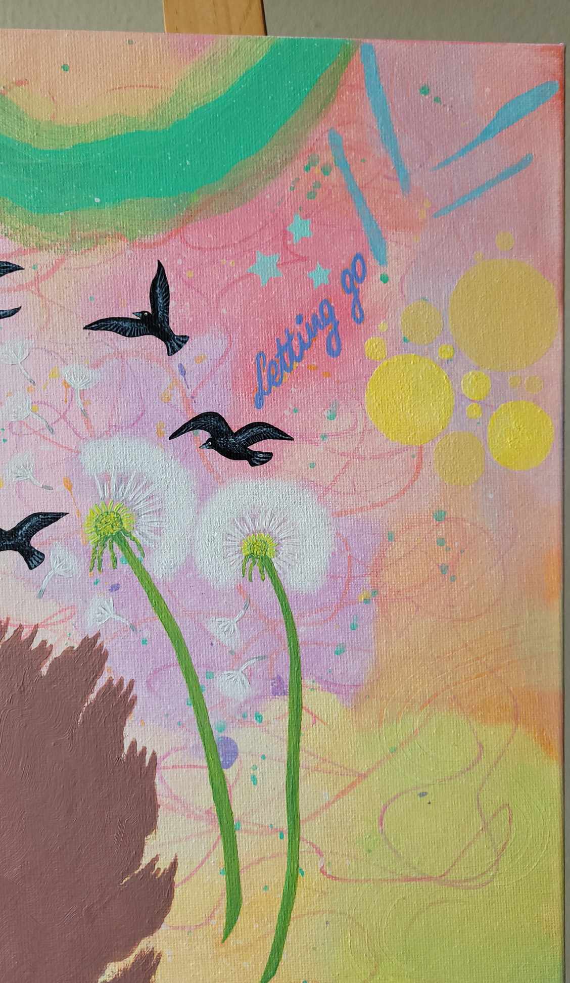 The entire artwork radiates with pastel hues, creating a dreamlike, uplifting and almost spring-like atmosphere. Abstract elements further enrich the composition, enhancing the emotional depth and artistic expression. But beyond the imagery, this piece carries something even more profound - words filled with intention and power. Scattered across the canvas, you will find: