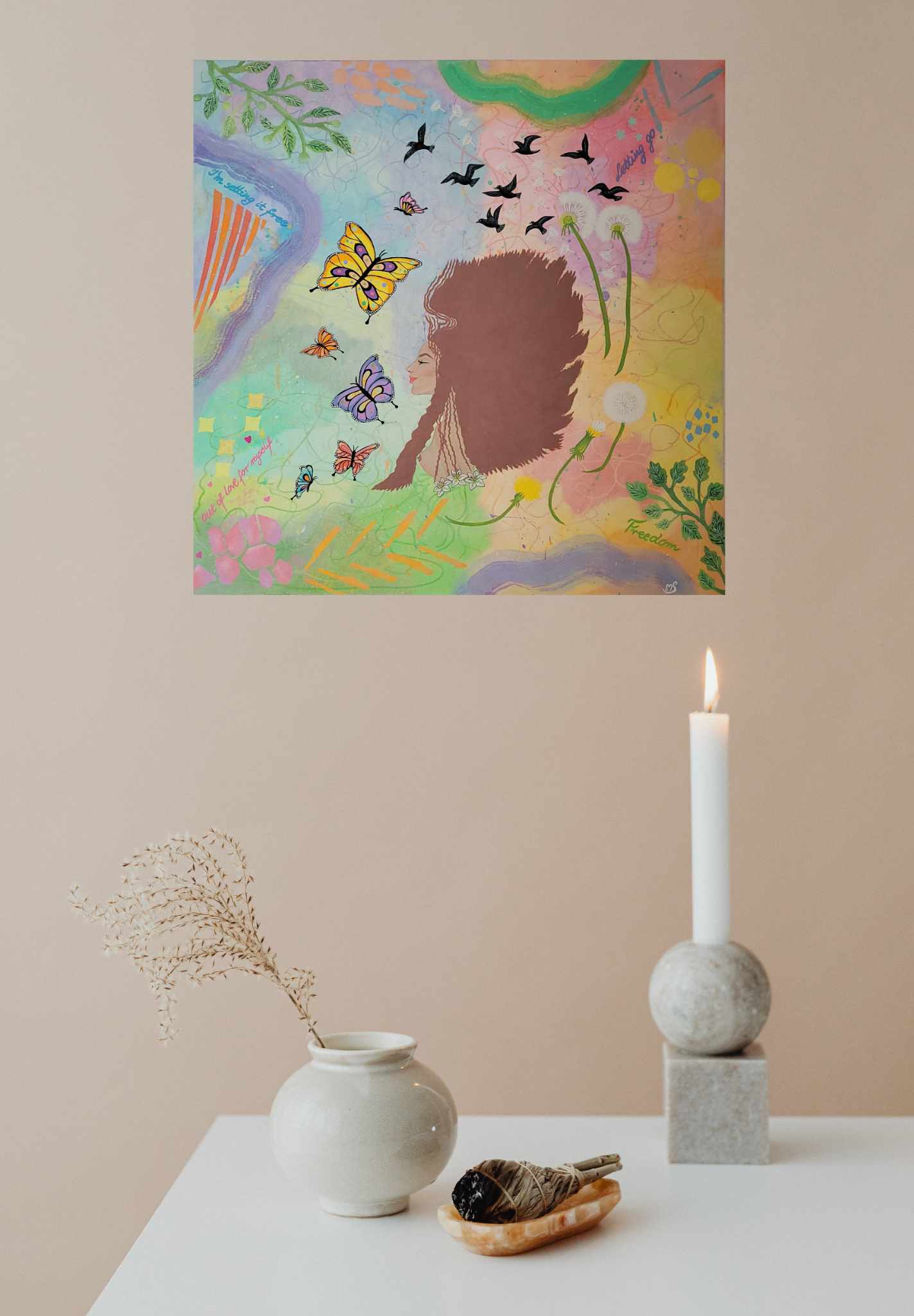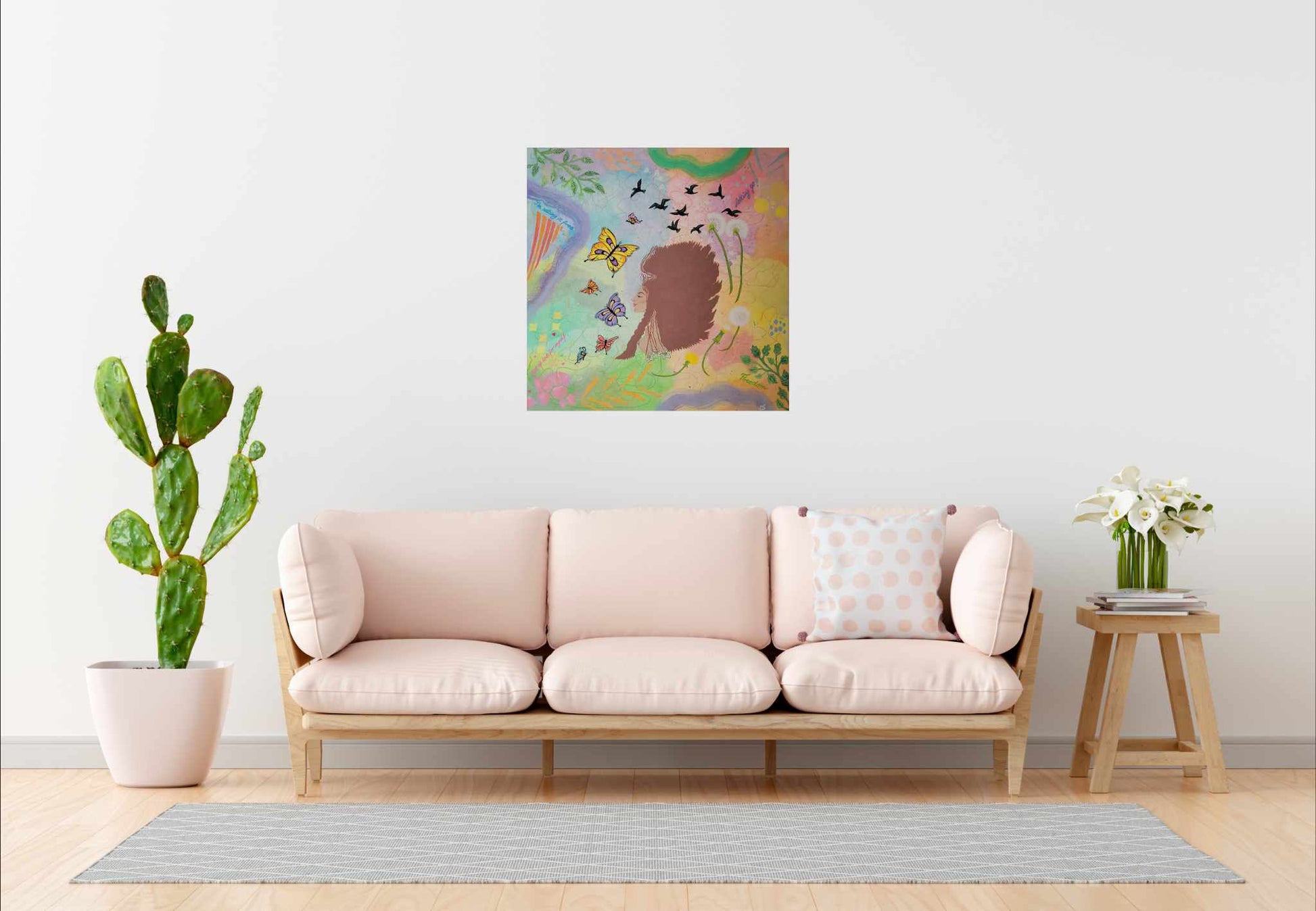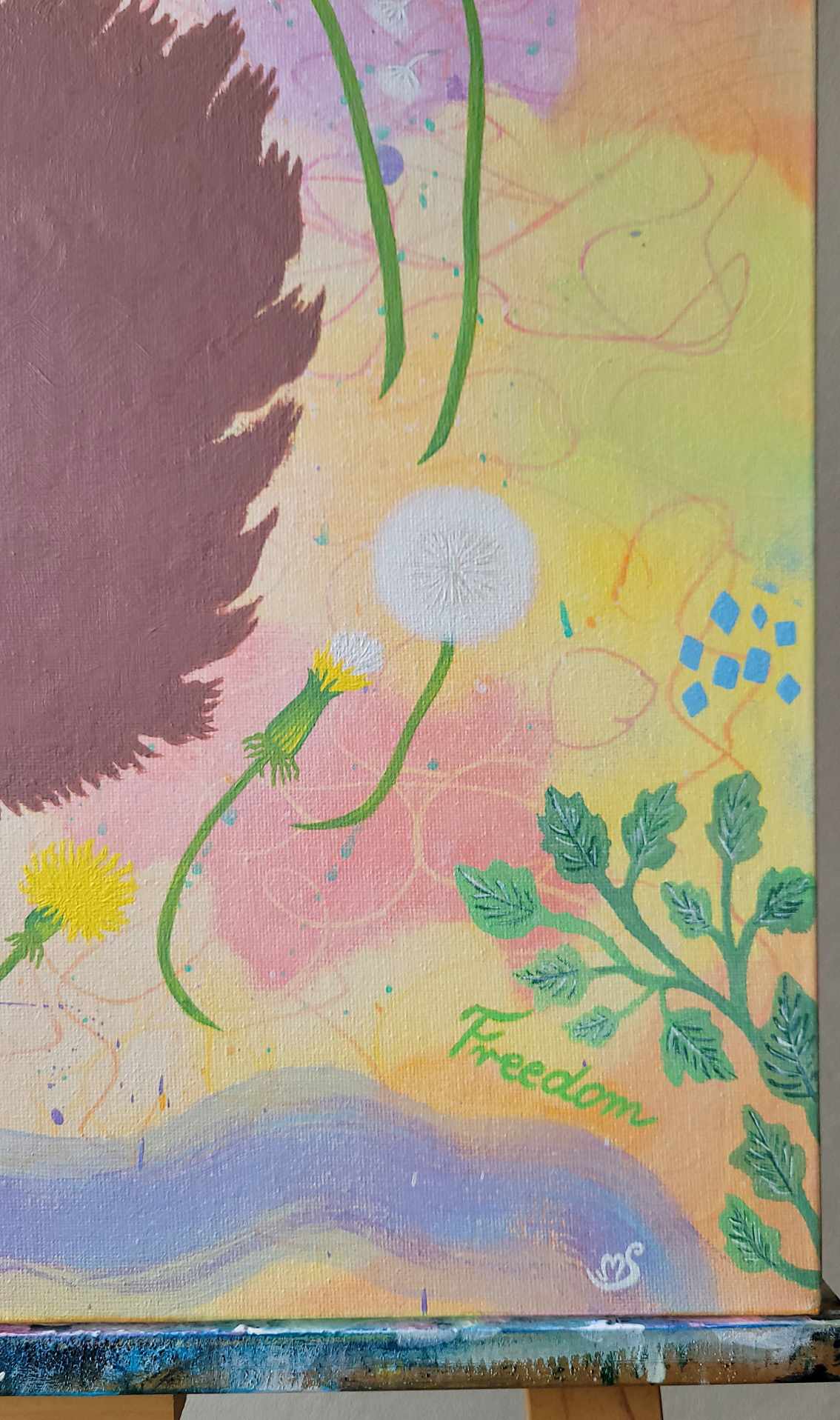 The entire artwork radiates with pastel hues, creating a dreamlike, uplifting and almost spring-like atmosphere. Abstract elements further enrich the composition, enhancing the emotional depth and artistic expression. But beyond the imagery, this piece carries something even more profound - words filled with intention and power. Scattered across the canvas, you will find: