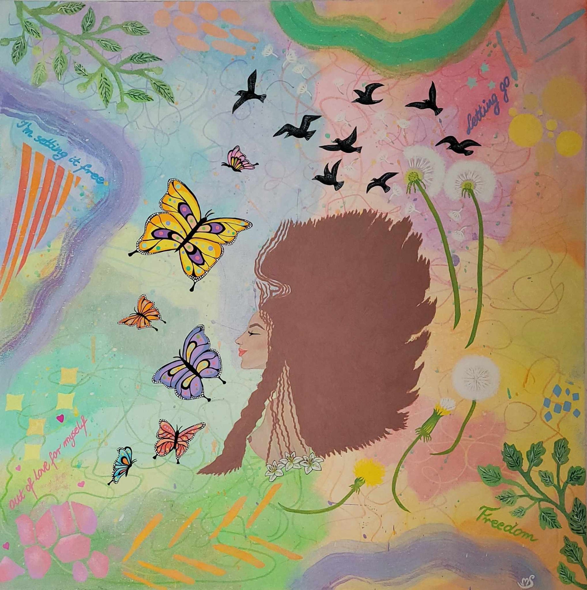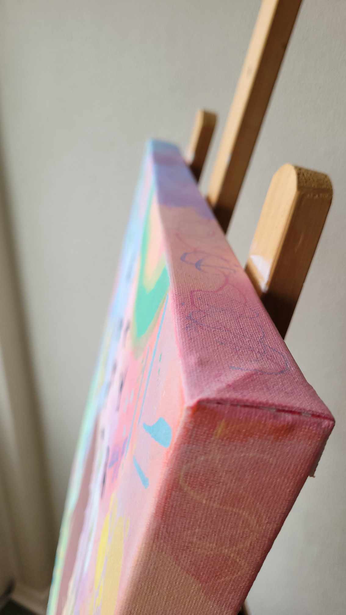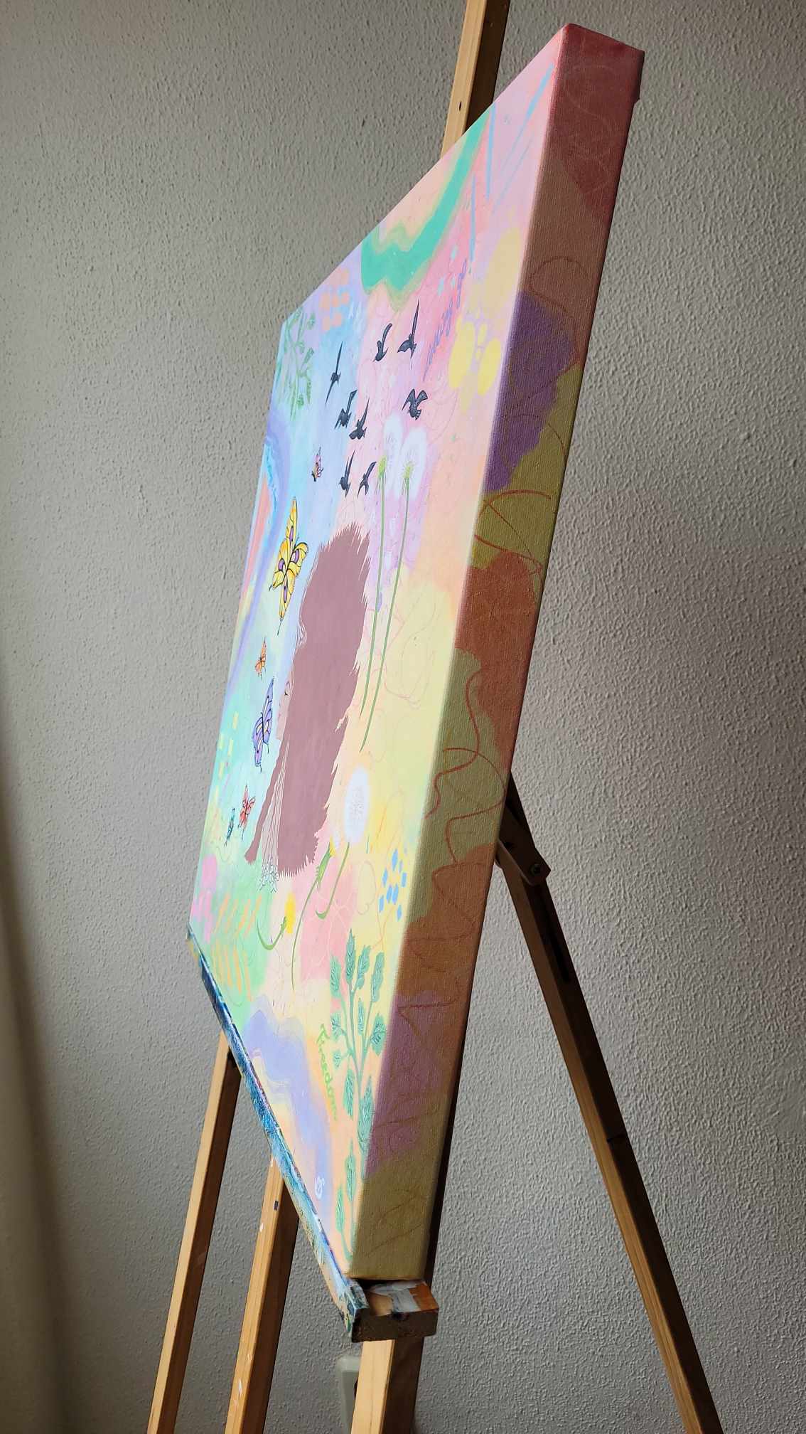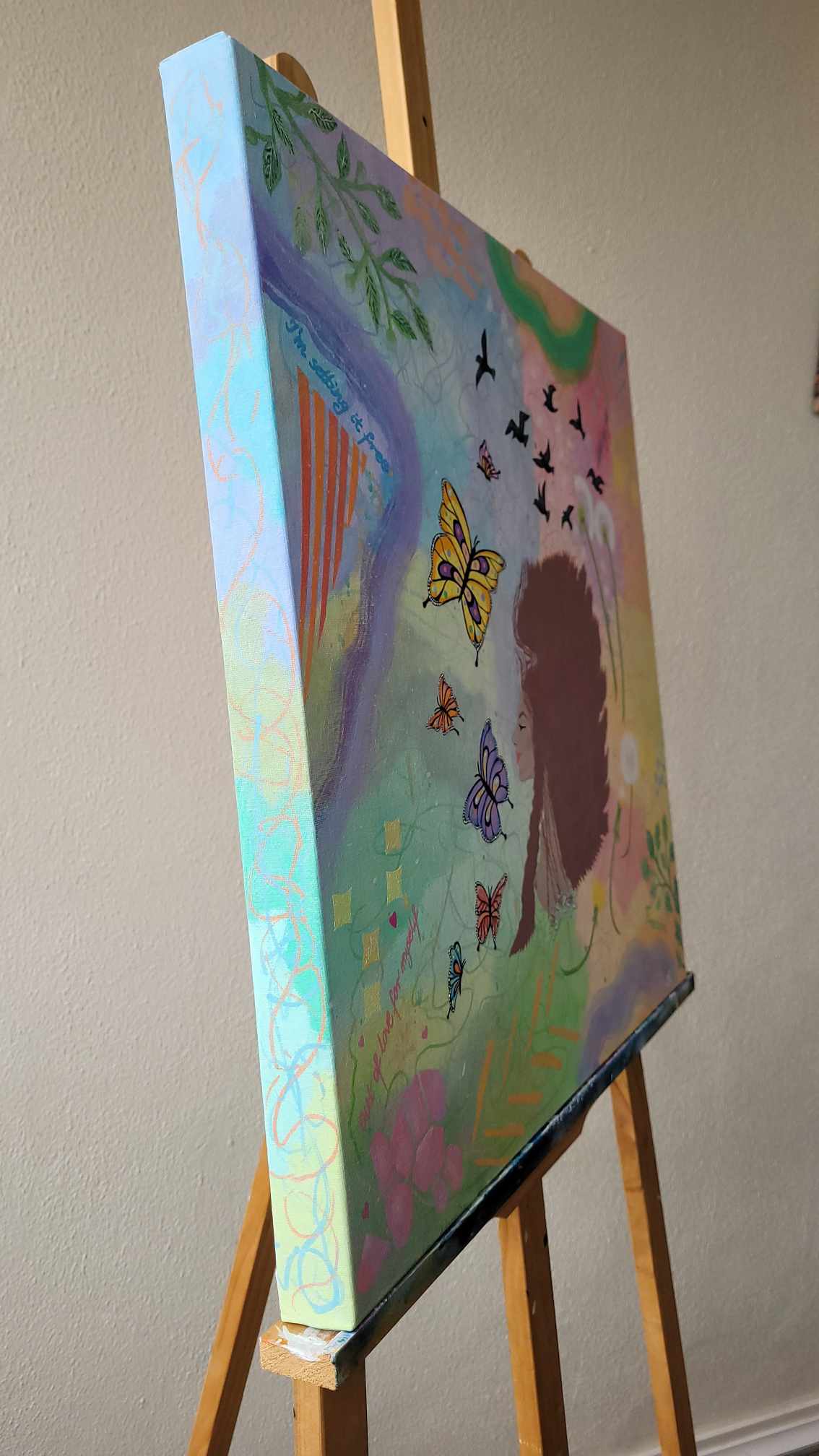 The entire artwork radiates with pastel hues, creating a dreamlike, uplifting and almost spring-like atmosphere. Abstract elements further enrich the composition, enhancing the emotional depth and artistic expression. But beyond the imagery, this piece carries something even more profound - words filled with intention and power. Scattered across the canvas, you will find: