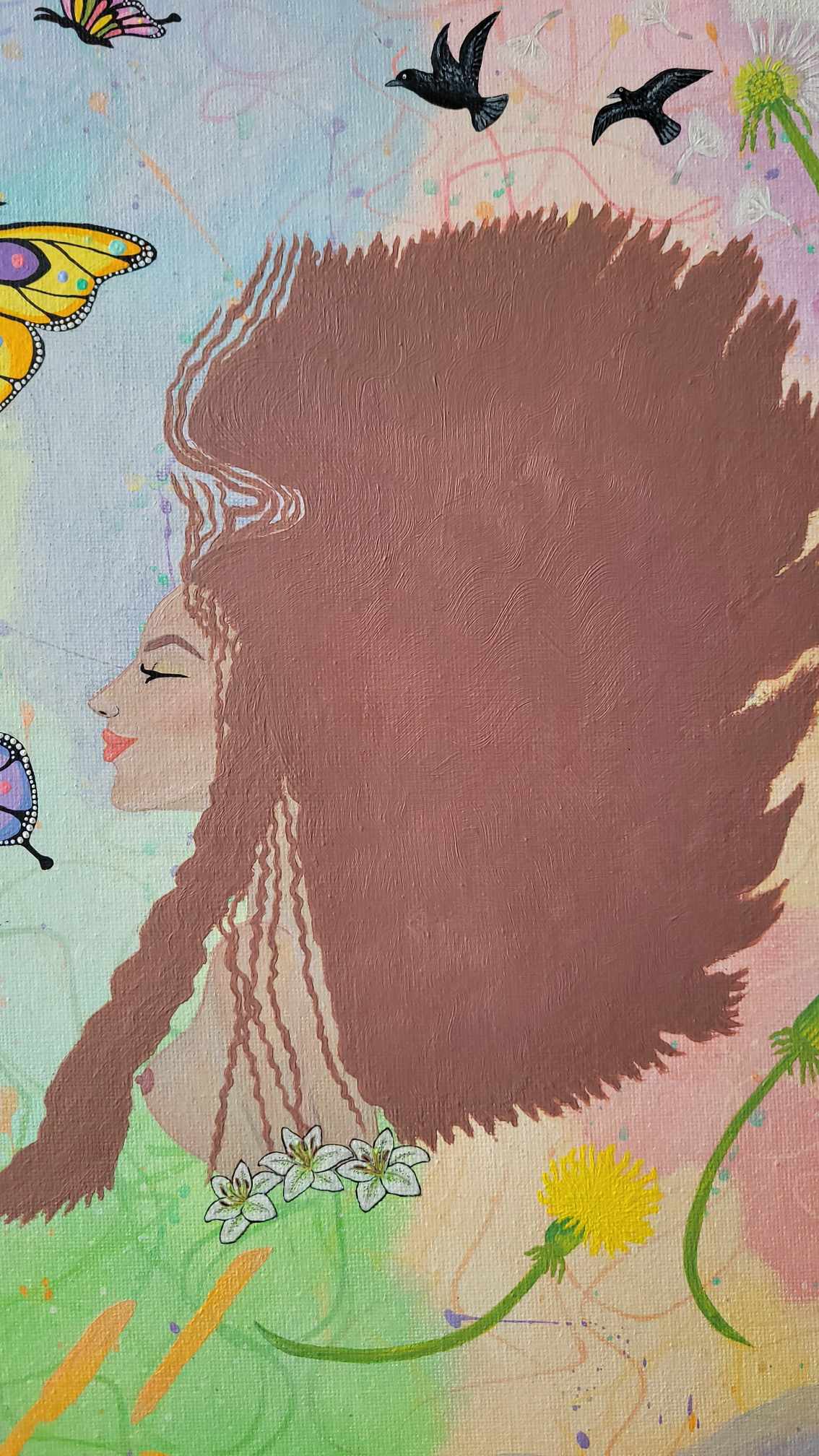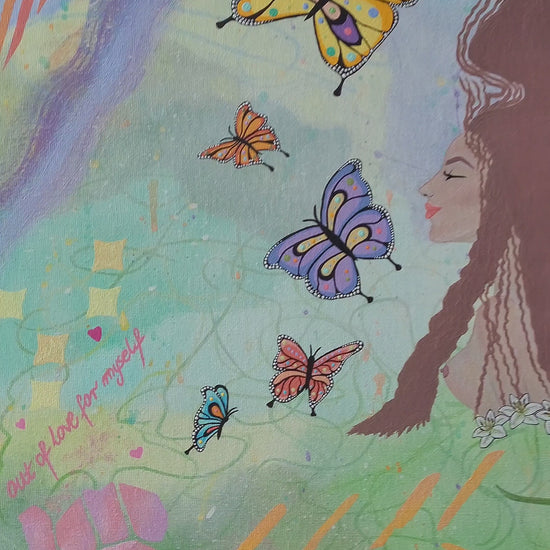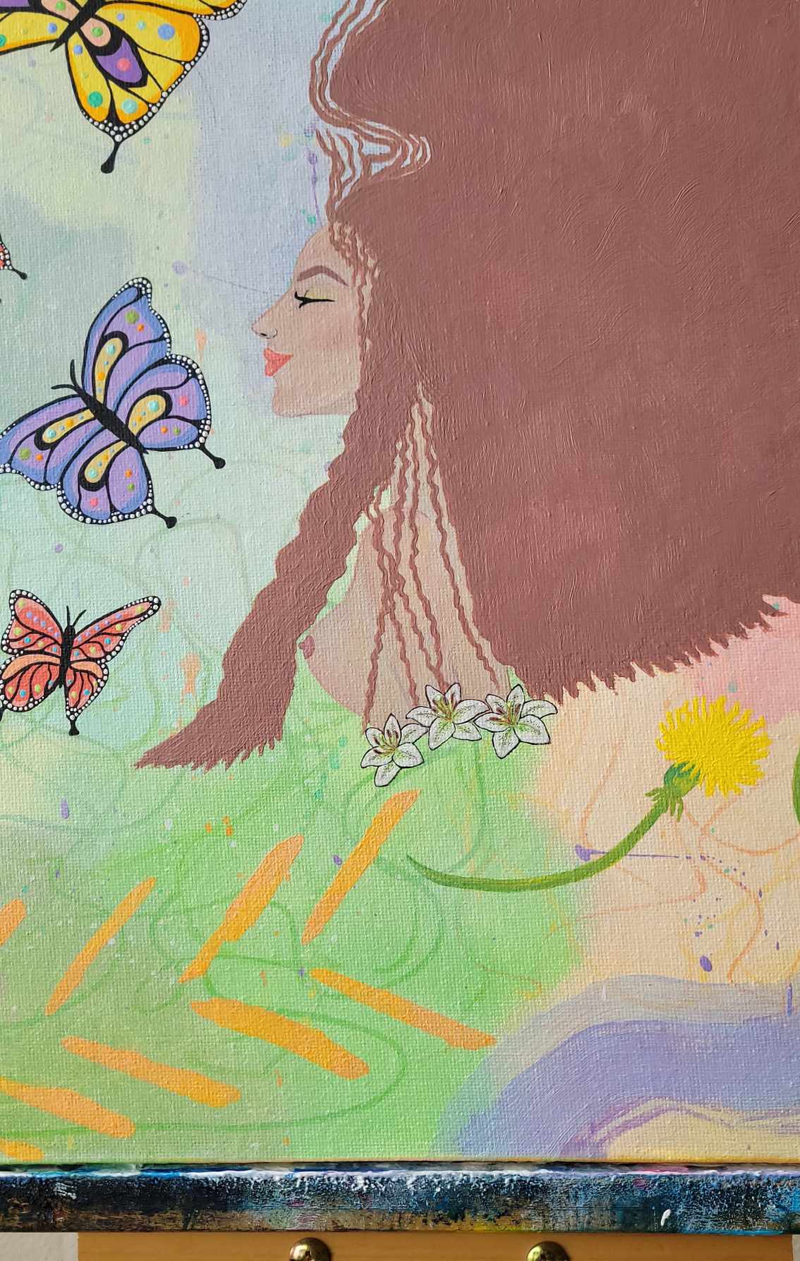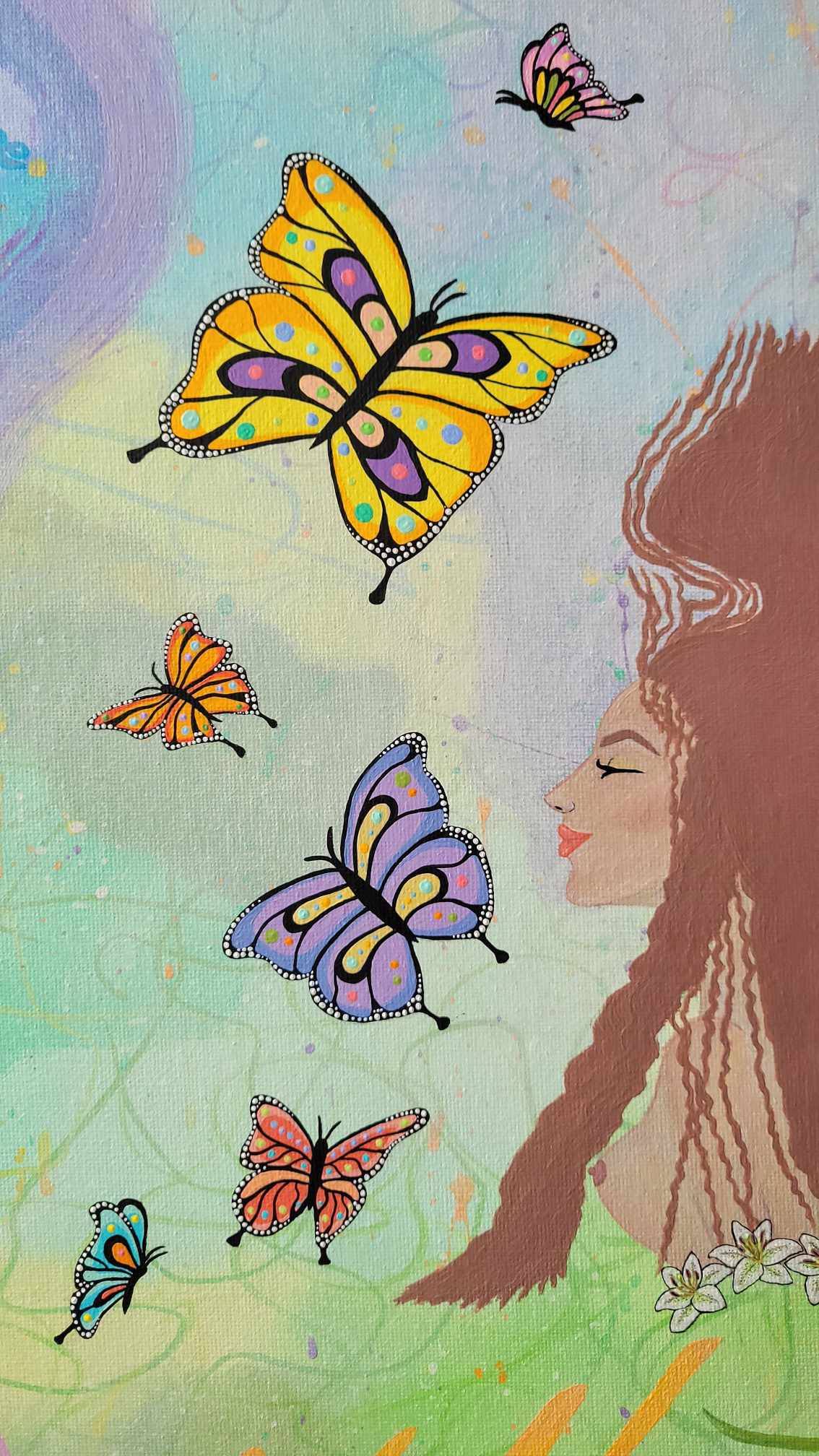On the left, six vibrant butterflies in different sizes flutter gracefully, representing rebirth, joy, and spiritual growth. The number 6 embodies harmony, love, and deep emotional connection, adding a nurturing energy to the piece. Two green branches delicately intertwine with the composition, anchoring the painting in nature’s embrace, reinforcing the connection between the soul and the earth.