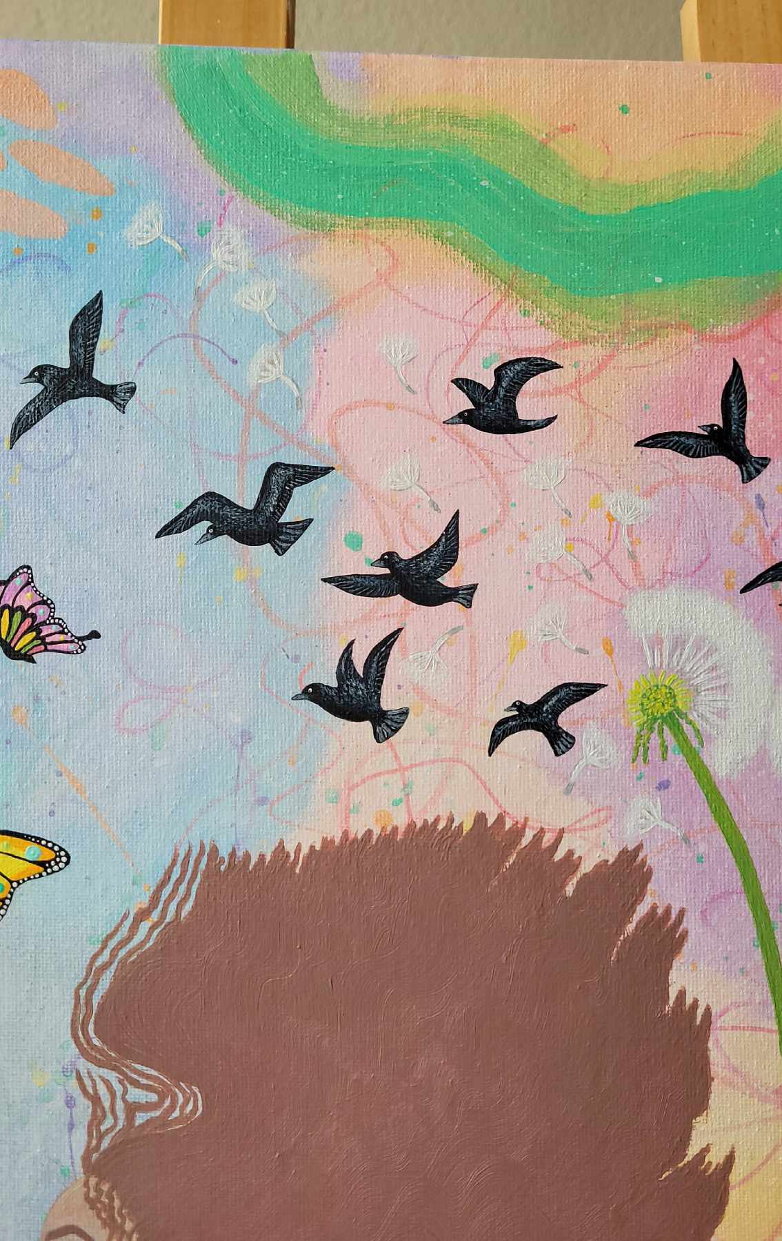 Surrounding her are symbols of change, renewal, and spiritual evolution. Five dandelions float on the right in different stages of bloom, carrying the essence of dreams, fulfillment, and the cycles of life. In numerology, the number 5 represents independence, openness to change, and the desire to embrace new experiences. Above them, eight crows soar freely, symbolizing wisdom, spiritual guidance, and the power of transformation. The number 8 resonates with abundance, strength, and inner balance.