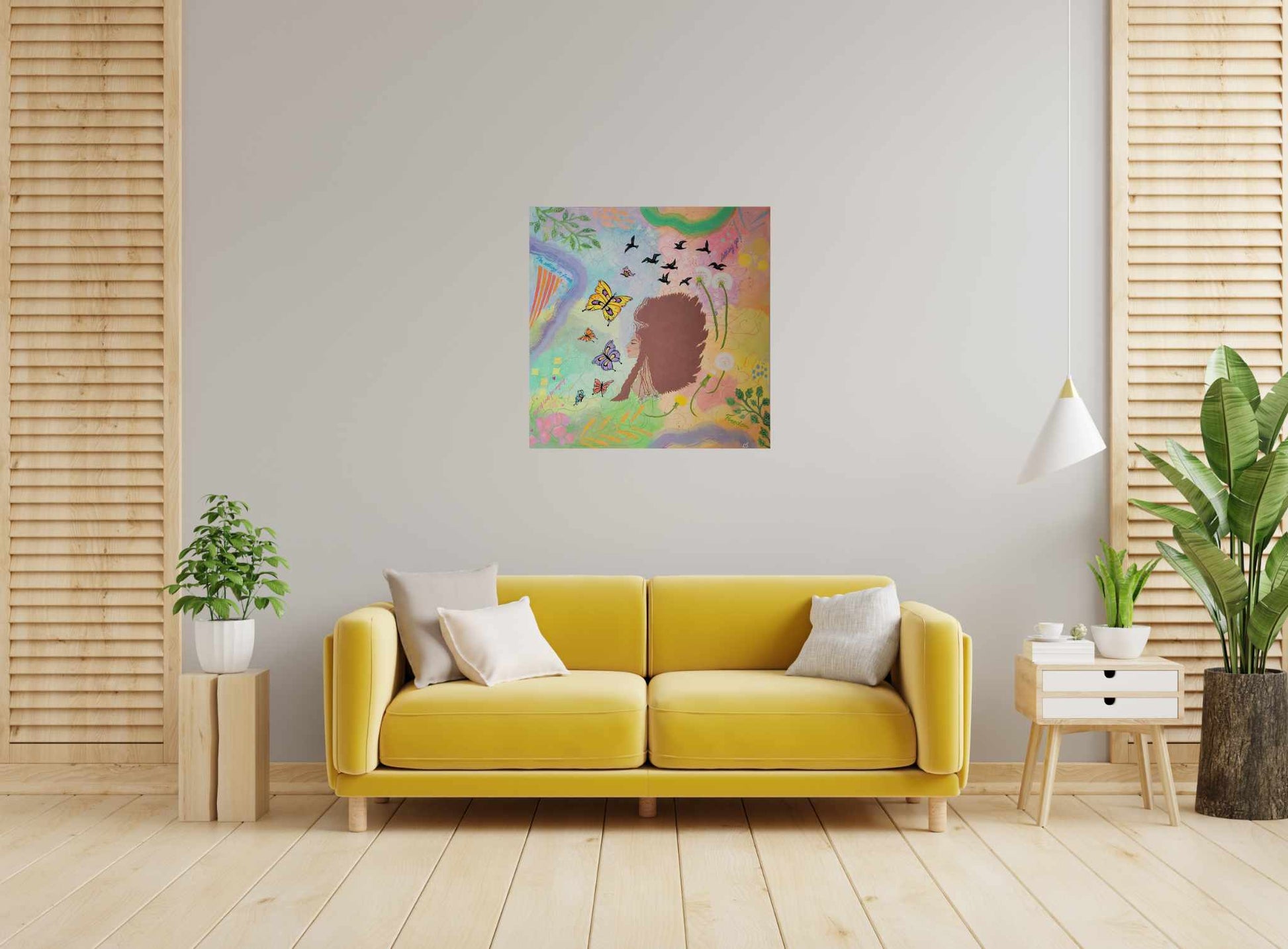 This piece is painted with acrylics on a 50 x 50 cm canvas, with 3.5 cm thick edges, beautifully blended with the background’s soft hues, making framing optional.